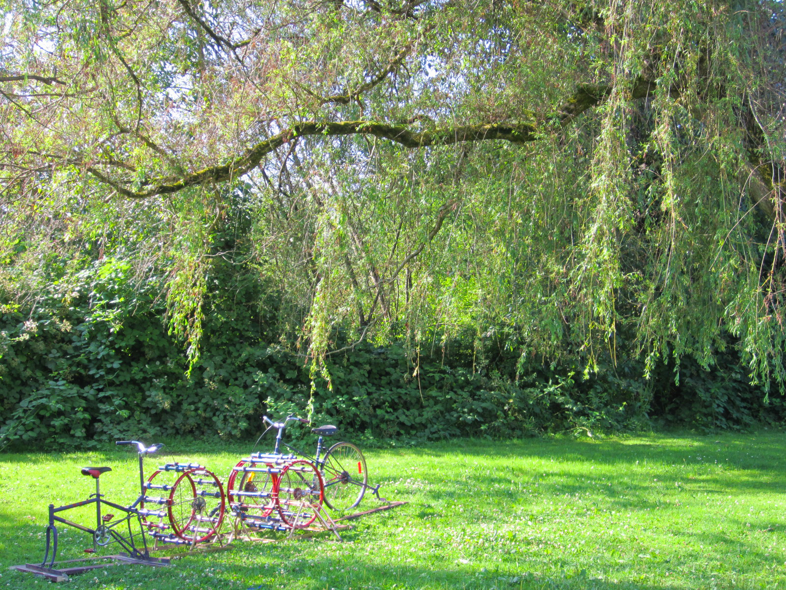 Bicycle Arpeggio is a kinetic musical sculpture created from recycled bicycles. The instrument’s design mimics a cylindrical roll common in early musical automatons such as barrel organs and music boxes. Steel bicycle frame tubing, tuned by length, are placed around the rotating cylinder and act as both the programmable score and the source of sound.… Continue reading Bicycle Arpeggio